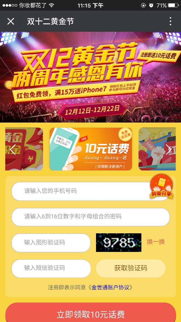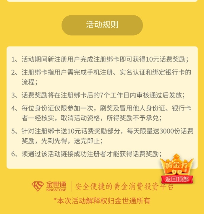 金世通 微信公众号的12.12黄金节活动,在活动期间内注册绑卡认证即送10元话费,每日限3000份,建议每天0点后去注册,话费会在7个工作日内发放